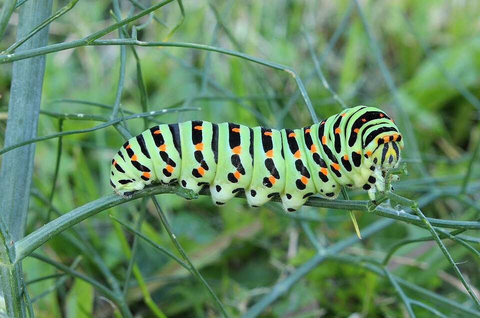 Gerade unsere typischen Gartenpflanzen wie Möhren, Dill oder Fenchel sind für den Schwalbenschwanz wichtige Futterpflanzen. Wenn er sie findet, legt das Weibchen dort seine Eier ab – meist einzeln und gut verteilt. Die jungen Raupen sind zunächst eher unscheinbar und fallen kaum auf. Erst in den späteren Stadien werden sie größer, auffälliger – und, wie ich finde, richtig schön.